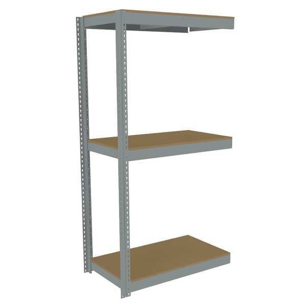 Description Boltless Shelving, Angle, Overall Depth 42 in, Overall Height 84 in, Overall Width 42 in, Shelf Gauge 14 ga, Shelf Adjustment Increments 1 1/2 in, Steel, Particleboard, Steel, (12) Beams, (2) Posts, Includes Decking Yes, 2,250 lb, Whole Unit Load Capacity 7,500 lb, Add-On, Open, Post Gauge 16 ga, Number of Shelves 3, Maximum Post Load Capacity 8,000 lb with Beams Evenly Spaced at 24 in, Powder Coated, Heavy-Duty, Gray