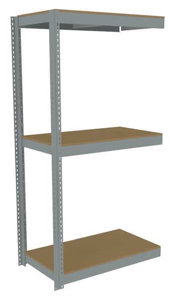 Description Boltless Shelving, Channel, Overall Depth 36 in, Overall Height 84 in, Overall Width 42 in, Shelf Gauge 14 ga, Shelf Adjustment Increments 1 1/2 in, Steel, Particleboard, Steel, (12) Beams, (2) Posts, Includes Decking Yes, 2,500 lb, Whole Unit Load Capacity 7,500 lb, Add-On, Open, Post Gauge 16 ga, Number of Shelves 3, Maximum Post Load Capacity 13,000 lb with Beam Evenly Spaced at 24 in, Powder Coated, Heavy-Duty, Gray