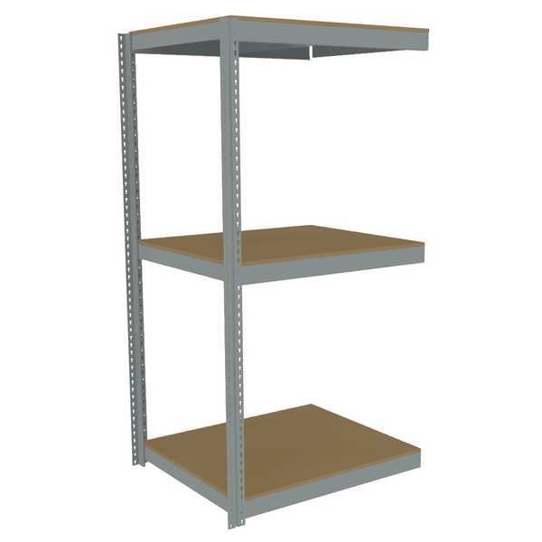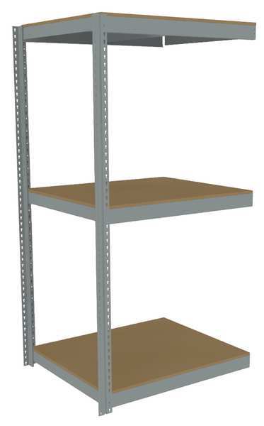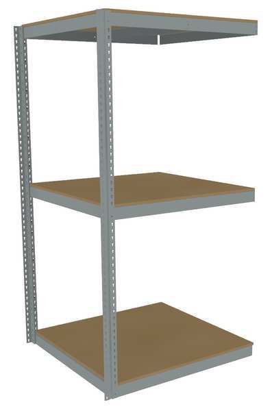 Description Boltless Shelving, Angle, Overall Depth 30 in, Overall Height 84 in, Overall Width 42 in, Shelf Gauge 14 ga, Shelf Adjustment Increments 1 1/2 in, Steel, Particleboard, Steel, (12) Beams, (2) Posts, Includes Decking Yes, 2,250 lb, Whole Unit Load Capacity 7,500 lb, Add-On, Open, Post Gauge 16 ga, Number of Shelves 3, Maximum Post Load Capacity 8,000 lb with Beams Evenly Spaced at 24 in, Powder Coated, Heavy-Duty, Gray