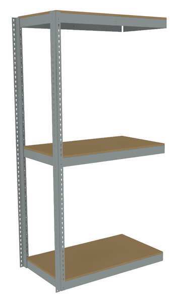 Description Boltless Shelving, Angle, Overall Depth 36 in, Overall Height 84 in, Overall Width 42 in, Shelf Gauge 14 ga, Shelf Adjustment Increments 1 1/2 in, Steel, Particleboard, Steel, (12) Beams, (2) Posts, Includes Decking Yes, 2,250 lb, Whole Unit Load Capacity 7,500 lb, Add-On, Open, Post Gauge 16 ga, Number of Shelves 3, Maximum Post Load Capacity 8,000 lb with Beams Evenly Spaced at 24 in, Powder Coated, Heavy-Duty, Gray