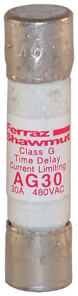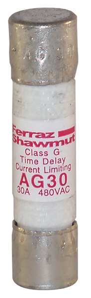 SKU G1034406CategoriesDescription Fuse, 30 A, 480V AC, Not Rated, Class G, AG Series, Nonindicating, Time Delay, Body Style Cylindrical, Rejection, Interrupt Rating 100kA at 480V AC, Fuse Size 1-5/8 in L x 13/32 in dia, Length 1 5/8 in, Diameter 13/32 in, Equivalent Brand and Series Bussmann SC, Littelfuse SLC, Mersen AG, Equivalent Series AG, SC, SLC, Body Material Fiberglass, Dual Element, Standards CSA Certified to C22.2 No. 248.5, UL Listed 248-5graingerSKU: 5LCN6, mscSKU: , zoro_no: G1034406, mongo_id: 65bbe80722d7a989a98d0bb5