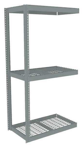 Description Boltless Shelving, Angle, Overall Depth 18 in, Overall Height 84 in, Overall Width 48 in, Shelf Gauge 14 ga, Shelf Adjustment Increments 1 1/2 in, Steel, None, Steel, (12) Beams, (2) Posts, Includes Decking No, 2,250 lb, Whole Unit Load Capacity 6,750 lb, Add-On, Open, SCS Indoor Advantage(R) Certified, Post Gauge 16 ga, Number of Shelves 3, Maximum Post Load Capacity 8,000 lb with Beams Evenly Spaced at 24 in, Powder Coated, Heavy-Duty, Gray