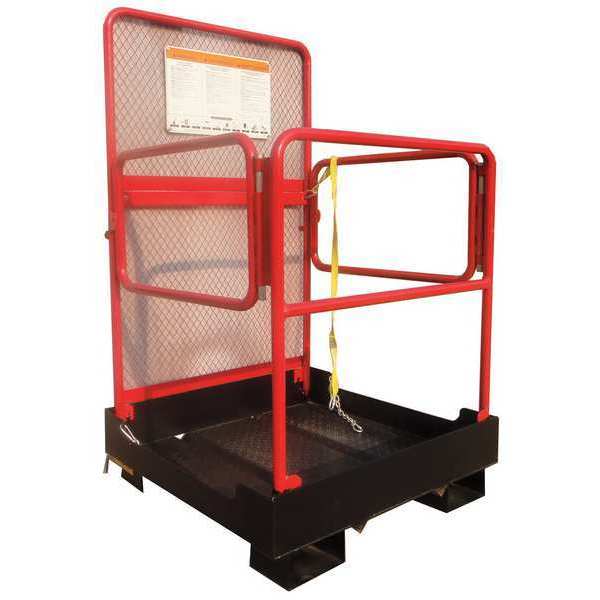 SKU G2127870CategoriesDescription Forklift Work Platform, Base Length 48 in, Base Width 36 in, Platform Length 48 in, Platform Width 36 in, Overall Height 66 in, Handrail Height 42 in, Fork Pocket Size 2 1/2 in x 7 1/2 in, Number of Guard Rails 3, Tread Perforated, Red/Black, Finish Powder Coated, For Use With Most Forklift Trucks, Unassembled, Includes Backrail, Guardrails, Safety Strap, Single Door, Load Capacity 1,000 lbgraingerSKU: 5UEW1, mscSKU: , zoro_no: G2127870, mongo_id: 65bbe59f3aaddbd5a9fd6c35