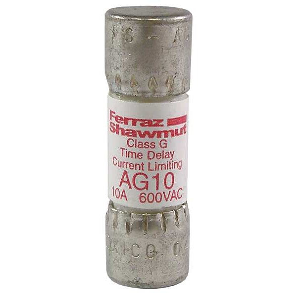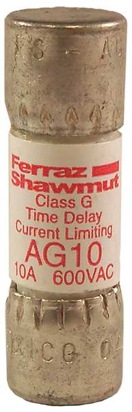 Description Fuse, 10 A, 600V AC, Not Rated, Class G, AG Series, Nonindicating, Time Delay, Body Style Cylindrical, Rejection, Interrupt Rating 100kA at 600V AC, Fuse Size 1-3/8 in L x 13/32 in dia, Length 1 3/8 in, Diameter 13/32 in, Equivalent Brand and Series Bussmann SC, Littelfuse SLC, Mersen AG, Equivalent Series AG, SC, SLC, Body Material Fiberglass, Dual Element, Standards CSA Certified to C22.2 No. 248.5, UL Listed 248-5