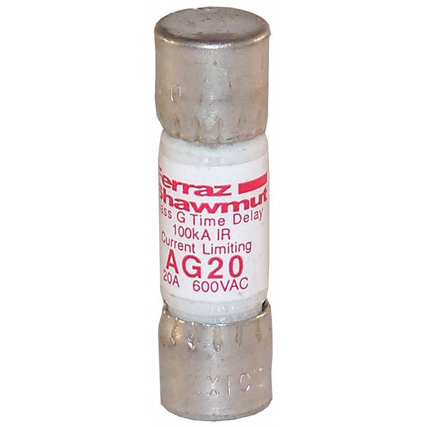 Description Fuse, 20 A, 600V AC, Not Rated, Class G, AG Series, Nonindicating, Time Delay, Body Style Cylindrical, Rejection, Interrupt Rating 100kA at 600V AC, Fuse Size 1-7/16 in L x 13/32 in dia, Length 1 7/16 in, Diameter 13/32 in, Equivalent Brand and Series Bussmann SC, Littelfuse SLC, Mersen AG, Equivalent Series AG, SC, SLC, Body Material Fiberglass, Dual Element, Standards CSA Certified to C22.2 No. 248.5, UL Listed 248-5