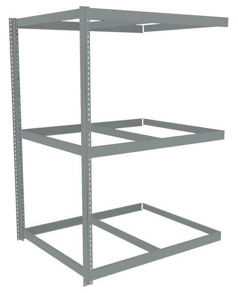 Description Boltless Shelving, Angle, Overall Depth 30 in, Overall Height 84 in, Overall Width 72 in, Shelf Gauge 14 ga, Shelf Adjustment Increments 1 1/2 in, Steel, None, Steel, (12) Beams, (2) Posts, Includes Decking No, 1,750 lb, Whole Unit Load Capacity 5,250 lb, Add-On, Open, SCS Indoor Advantage(R) Certified, Post Gauge 16 ga, Number of Shelves 3, Maximum Post Load Capacity 8,000 lb with Beams Evenly Spaced at 24 in, Powder Coated, Heavy-Duty, Gray