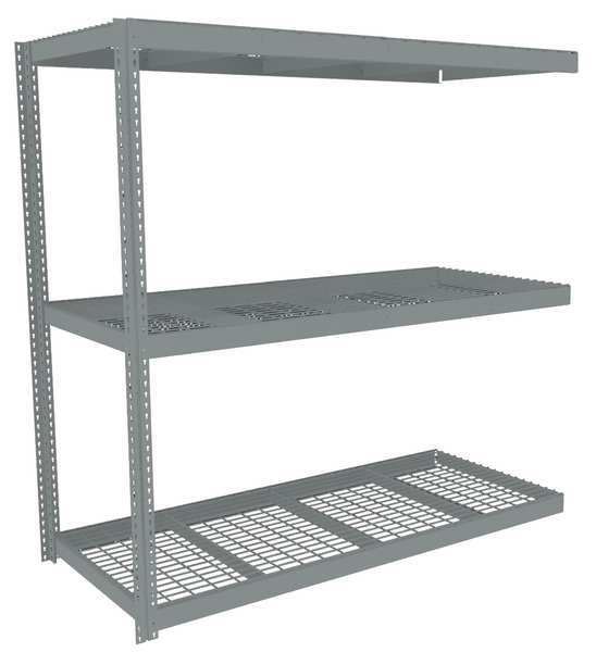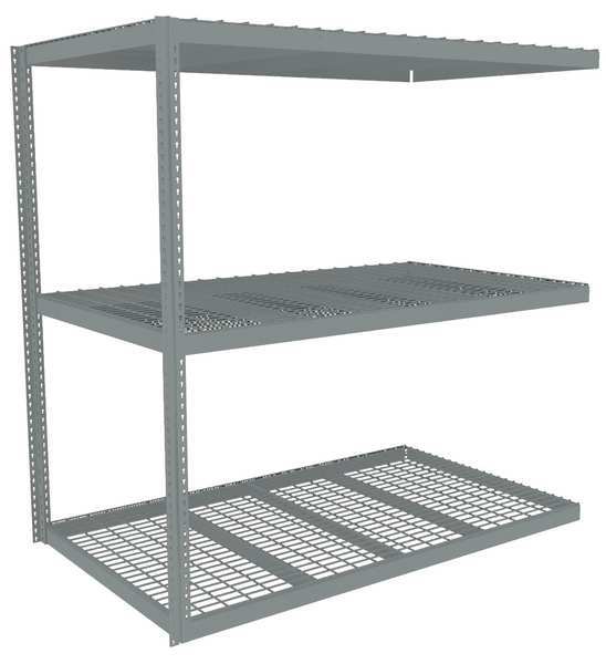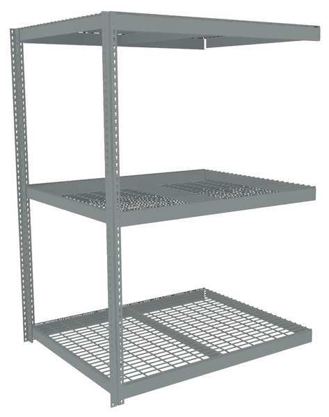 $739.99 / eachWeb priceBoltless Shelving, Add-On, 96x30, WireSKU G9876921CategoriesDescription Boltless Shelving, Channel, Overall Depth 30 in, Overall Height 84 in, Overall Width 96 in, Shelf Gauge 14 ga, Shelf Adjustment Increments 1 1/2 in, Steel, Steel, Steel, (12) Beams, (2) Posts, Includes Decking Yes, 1,600 lb, Whole Unit Load Capacity 4,800 lb, Add-On, Open, SCS Indoor Advantage(R) Certified, Post Gauge 16 ga, Number of Shelves 3, Maximum Post Load Capacity 13,000 lb with Beam Evenly Spaced at 24 in, Powder Coated, Heavy-Duty, GraygraingerSKU: 44P358, mscSKU: , zoro_no: G9876921, mongo_id: 65bbe9f322d7a989a9987ffb