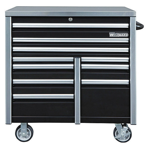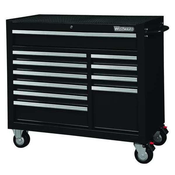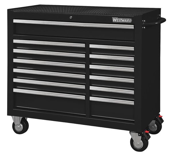 Description Rolling Tool Cabinet, Width 42 in, Height 46 3/16 in, Number of Drawers 10, Drawer Color Black, Storage Capacity 25,950 cu in, Caster Size 6 in x 2 in, Number of Shelves 0, Steel, 16, 14 Gauge, Work Surface Material EVA, Caster Wheel Material Polyurethane, Caster Type Solid, Keyed, Easy Grip Steel Handles, For Use With 49NR85, Includes Side Handle, Key Set