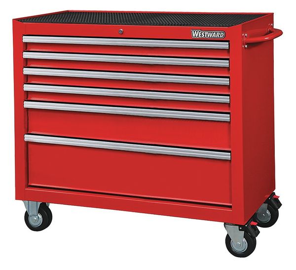 Description Rolling Tool Cabinet, Heavy Duty, Width 42 in, Depth 18 15/16 in, Height 39 13/16 in, Number of Drawers 6, Red, Drawer Color Red, Drawer Capacity 100 lb Shallow, 200 lb Deep, Ball Bearing Drawer Slides, Powder Coated Finish, Storage Capacity 15,426 cu in, Load Rating 1540 lb, Caster Size 5 in x 2 in, Number of Shelves 0, Steel, Drawers: 18, Body: 20 Gauge, Work Surface Material Polyethylene Foam, Caster Wheel Material Thermoplastic Rubber, Caster Type Solid, Keyed, Tubular Side Handles