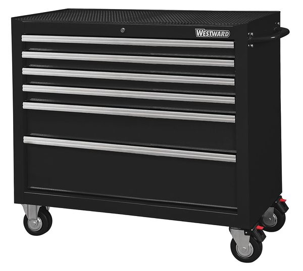 Description Rolling Tool Cabinet, Heavy Duty, Width 42 in, Depth 18 15/16 in, Height 39 13/16 in, Number of Drawers 6, Black, Drawer Color Black, Drawer Capacity 100 lb Shallow, 200 lb Deep, Ball Bearing Drawer Slides, Powder Coated Finish, Storage Capacity 15,426 cu in, Load Rating 1540 lb, Caster Size 5 in x 2 in, Number of Shelves 0, Steel, Drawers: 18, Body: 20 Gauge, Work Surface Material Polyethylene Foam, Caster Wheel Material Thermoplastic Rubber, Caster Type Solid, Keyed, Tubular Side Handles