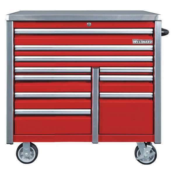 Description Rolling Tool Cabinet, Width 42 in, Height 46 3/16 in, Number of Drawers 10, Red, Drawer Color Red, Drawer Capacity 250 lb, Ball Bearing Drawer Slides, Storage Capacity 25,950 cu in, Load Rating 250 lb, Caster Size 6 in x 2 in, Number of Shelves 0, Steel, 16, 14 Gauge, Work Surface Material EVA, Caster Wheel Material Polyurethane, Caster Type Solid, Keyed, Easy Grip Steel Handles, For Use With 49NR84, Includes Side Handle, Key Set