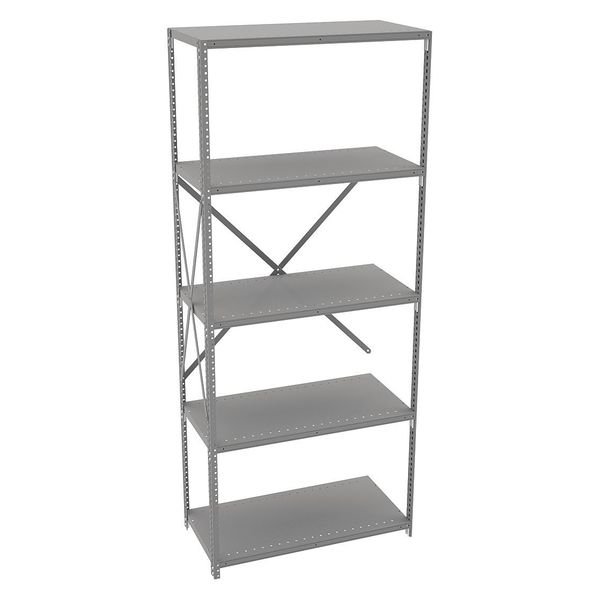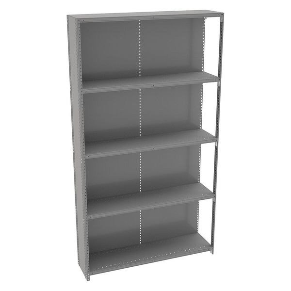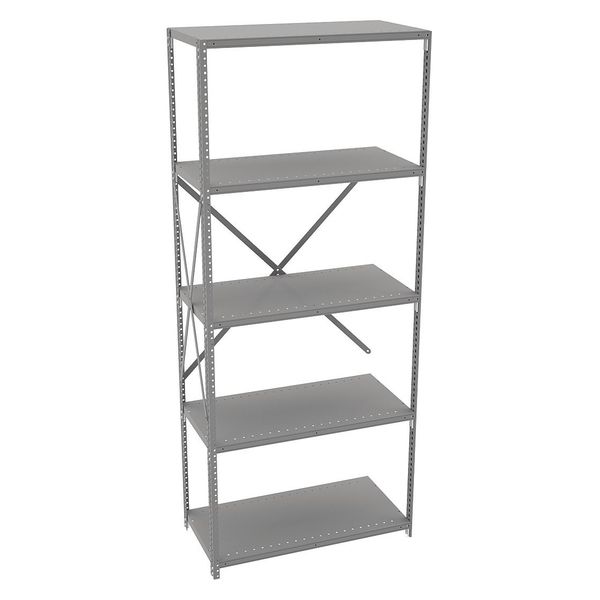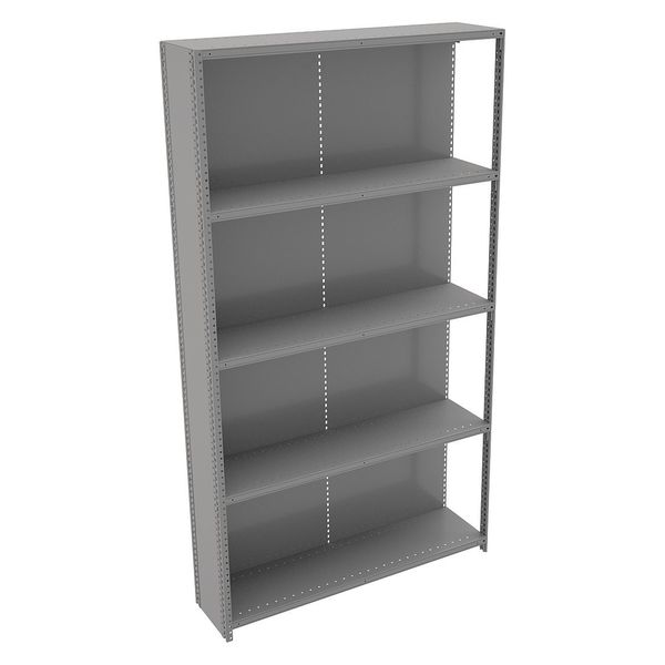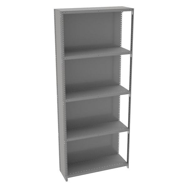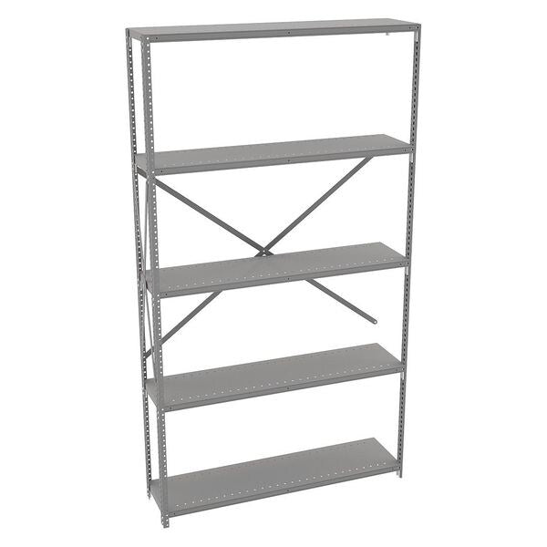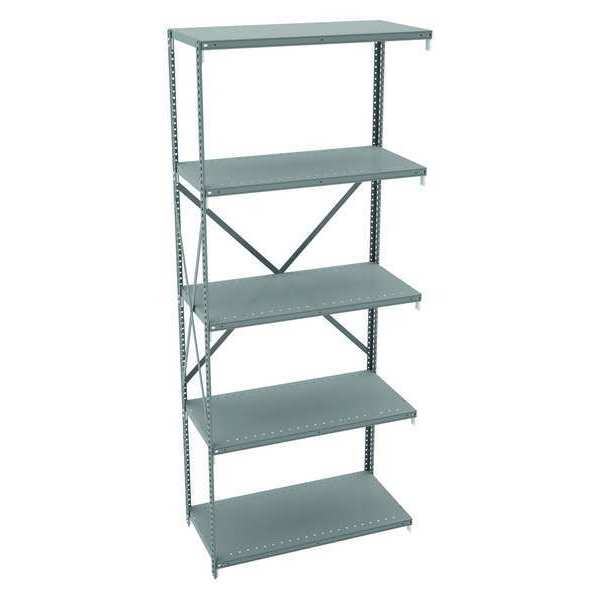 Description Metal Shelving, Gray, Powder Coated, Frame Material Steel, Load Capacity per Shelf 750 lb, Whole Unit Load Capacity 5,000 lb, Number of Shelves 5, Overall Depth 12 in, Overall Height 84 in, Overall Width 36 in, Post Construction Bead, Shelf Configuration Add-On, Shelf Style Solid, Shelving Material Steel, Assembled Unassembled, Shelving Gauge 22 ga, Post Gauge 14 ga, Shelf Adjustment Increments 1 in, Number of Drawers 0, Duty Rating Medium-Duty