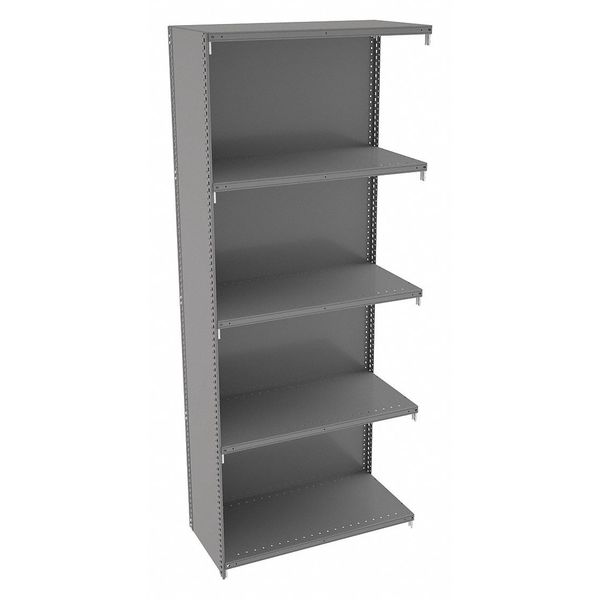 Description Metal Shelving, Gray, Powder Coated, Frame Material Steel, Load Capacity per Shelf 750 lb, Whole Unit Load Capacity 3,750 lb, Number of Shelves 5, Overall Depth 12 in, Overall Height 84 in, Overall Width 36 in, Post Construction Bead, Shelf Configuration Add-On, Shelf Style Solid, Shelving Material Steel, Assembled Unassembled, Shelving Gauge 22 ga, Post Gauge 14 ga, Shelf Adjustment Increments 1 in, Number of Drawers 0, Duty Rating Medium-Duty