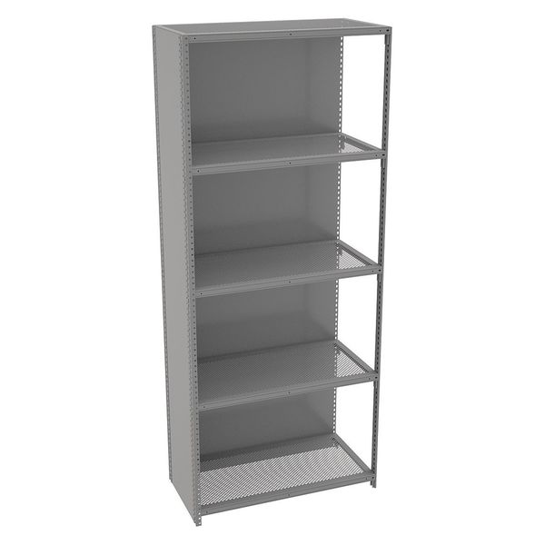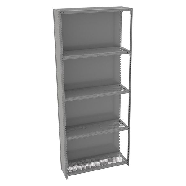 Description Metal Shelving, Gray, Powder Coated, Frame Material Steel, Load Capacity per Shelf 750 lb, Whole Unit Load Capacity 3,750 lb, Number of Shelves 5, Overall Depth 12 in, Overall Height 84 in, Overall Width 36 in, Post Construction Bead, Shelf Configuration Add-On, Shelf Style Ventilated, Shelving Material Steel, Assembled Unassembled, Shelving Gauge 22 ga, Post Gauge 14 ga, Shelf Adjustment Increments 1 in, Number of Drawers 0, Duty Rating Medium-Duty
