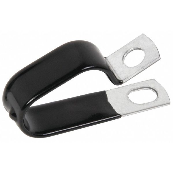 Description Cable Clamp, Cable Clamp, Medium Duty with Cushion, Galvanized Steel, Cable Clamping Dia. 7/16 in, Mounting Hole Dia. 0.3438 in, Clamp Thickness 0.048 in, Clamp Band Width 5/8 in, Gray, Vinyl Cushion Type, Hot Dipped Galvanized Clamp Finish, Temp. Range (F) -30 to +180, Vinyl Plastisol Coating Material, Liner Color Black, Package Quantity 10