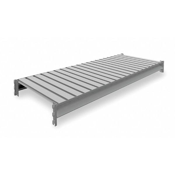 Description Shelf, Color Industrial Gray, Steel Frame Material, Overall Depth 24 in, Overall Height 3 5/8 in, Overall Width 96 in, Epoxy Coated Frame Finish, Includes (2) 24 in Beams, (2) 96 in Beams, (4) 24 in Cross Bars, Includes Decking No, Includes Mounting Hardware Yes, Mounting Hardware Required No, Load Capacity 2,150 lb, 14 ga, SCS Standards
