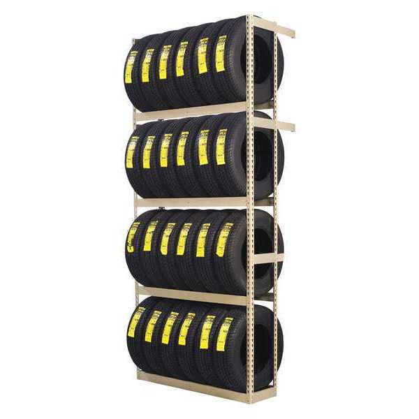 Description Single Sided Boltless Tire Rack, Starter Unit Shelf Configuration, Shelf Depth 12 in, 2,000 lb Load Capacity per Shelf, Number of Shelves 4, Number of Usable Sides 1, Maximum Number of Tires Held 32, Overall Depth 18 in, Overall Height 10 ft, Overall Width 60 in, 12 in Deep Unit, 9 in Wall Tie, Medium Gray, Powder Coated, Steel