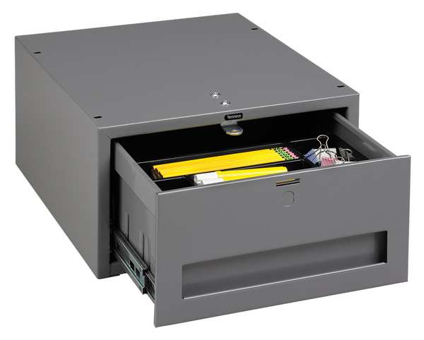 Description Stackable Drawer, Product Type Drawer, Assembly Unassembled, Color Gray, Compatible with Manufacturer Part Number WB-1, WBA-1, WBAT-1, Drawer Slide Bearing Type Padlock Hasp, Drawer Divider, Removable Tray And Knock-Out For Key Lock;Ball Bearing, Finish Powder Coated, For Use With All Workbenches, Includes Mounting Hardware Yes, Lock Type Keyed, Material Steel, Metal Material Gauge 24 ga, Mounting Location Under Bench, Overall Depth 18 in, Overall Height 8 1/4 in, Overall Load Capacity 70 lb