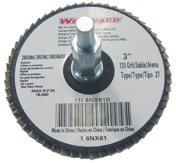 $6.44 / eachWeb priceArbor Mount Flap Disc, 3in, 120, FineSKU G2180044CategoriesDescription Flap Disc, Abrasive Type Coated, Abrasive Material Zirconia Alumina, Grade Fine, Connector Size 1/4 In.- 20, Connector Type Unthreaded Hole, Flap Disc Type Type 27, Overall Diameter 3 in, Series Heavy Duty, Backing Material Fiberglass, Grit 120, Maximum Operating Speed 18,000 RPMgraingerSKU: 6NX61, mscSKU: , zoro_no: G2180044, mongo_id: 65bbe81a9a749db822775581