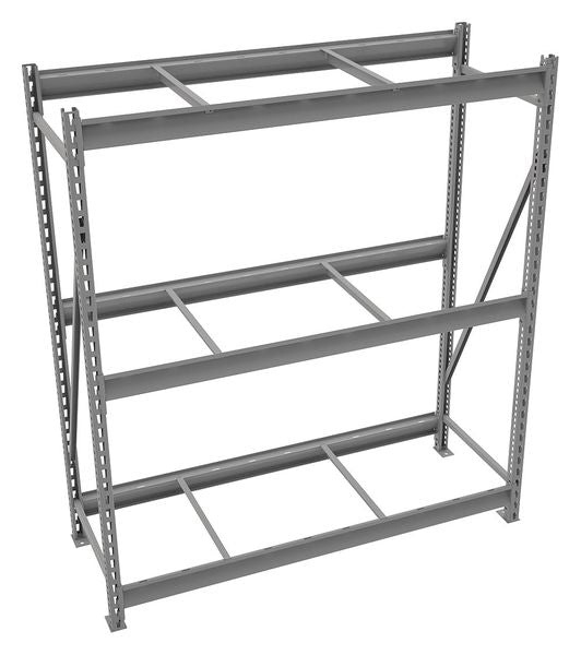 Description Bulk Storage Rack, Shelving Type Starter, Overall Width 72 in, Overall Depth 24 in, Overall Height 72 in, Decking Material None, No. of Shelves 3, Shelf Capacity 2750 lb, Load Capacity 8250 lb, Shelving Frame Material Steel, Gray, Finish - Shelving and Racks Powder Coated, Shelf Adjustments 2 in, Shelving Post Gauge 14, For Use With Tennesco Bulk Storage and Boltless Racks, Includes (2) End Frames, (3) Shelves