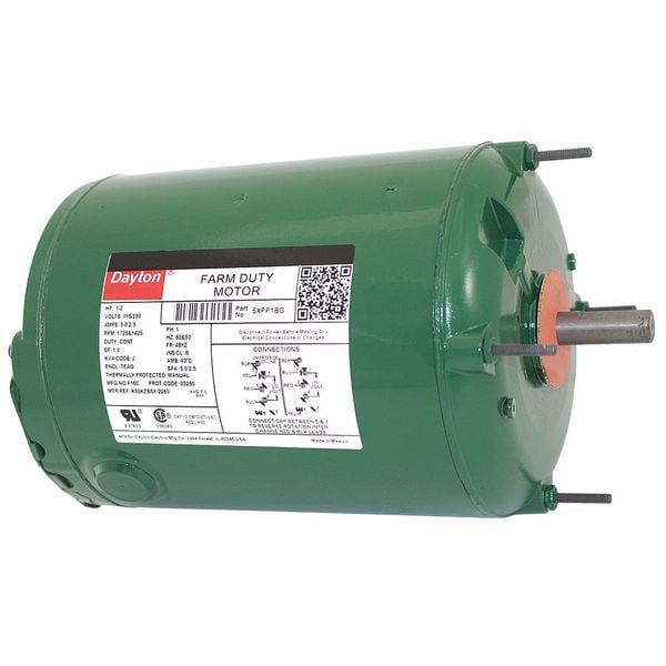 Description Agricultural Fan Motor, Single Phase, Motor Design Permanent Split Capacitor, 1 HP, Nameplate RPM 850, No. of Speeds 1, Voltage 230V AC, Full Load Amps 5.8 A, 56CZ Frame, 60 Hz Hz, Motor Service Factor 1, Motor Thermal Protection Auto, Ins. Class B, Max. Ambient Temp. 40 Degrees C, Duty Cycle Continuous, Motor Shaft Rotation CW, Motor Enclosure Design Totally Enclosed Air-Over, Motor Mounting Type Face, Motor Mounting Position All Angle, Motor Frame Material Rolled Steel, Finish Green
