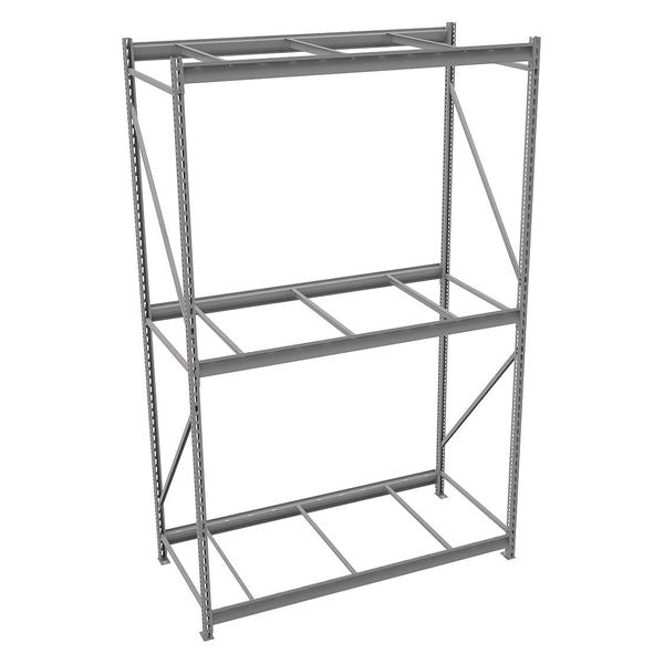 Description Bulk Storage Rack, Shelving Type Starter, Overall Width 60 in, Overall Depth 36 in, Overall Height 96 in, Decking Material None, No. of Shelves 3, Shelf Capacity 3800 lb, Load Capacity 11,400 lb, Shelving Frame Material Steel, Gray, Finish - Shelving and Racks Powder Coated, Shelf Adjustments 2 in, Shelving Post Gauge 14, For Use With Tennesco Bulk Storage and Boltless Racks, Includes (2) End Frames, (3) Shelves