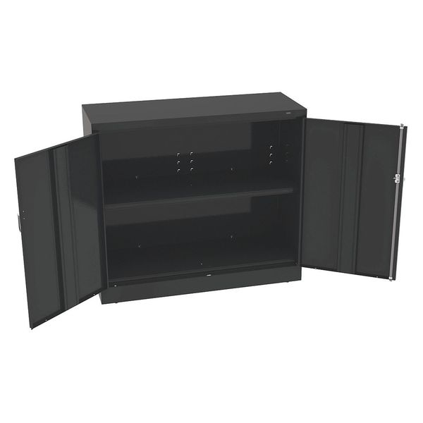 Description Storage Cabinet, Base Type Leveling, Body Panel Type Solid, Cabinet Color Black, Cabinet Material Steel, Cabinet Storage Components Shelves, Door Handle Type Swing, Door Type Solid, Duty Rating Medium Duty, For Use Indoors/Outdoors No, Frame Assembled Assembled, Load Capacity per Shelf 400 lb, Lock Type Keyed, Mobility Stationary, Mounting Location Freestanding, Number of Shelves 2, Overall Depth 18 in, Overall Height 42 in, Overall Width 48 in, Audit Trail Storage None