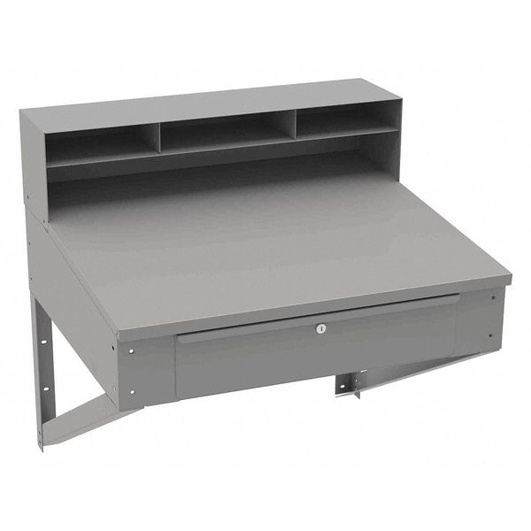 Description Wall Hanging Foreman's Desk, Overall Width 34 1/2 in, Overall Height 17 1/2 in, Overall Depth 29 in, Self-Closing No, Lockable Yes, Number of Drawers 1, Color Gray, Material 14 ga Steel, Writing Surface Slope Yes, Assembly Not Required, Standards SCS GOLD, Includes Fully Progressive Ball Bearing Suspension, Keyed Alike, Riser with Compartments, Wall Mounting Bracket