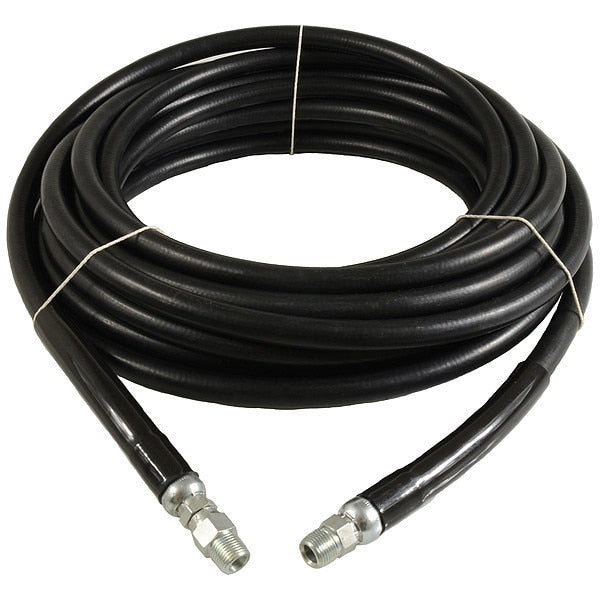 Description Pressure Washer Hose, Hose Inside Dia. 3/8 in, Hose Outside Dia. 0.69 in, Hose Length 50 ft, Hose Color Black, Hose Tube Material Nitrile, Hose Cover Material Neoprene, Max. Working Pressure @ 70 F 4,500 psi, Standards RMA Class B, Hose Fitting A Material Carbon Steel, Hose Fitting B Material Carbon Steel, Hose Fitting A Type MNPT, Hose Fitting B Type MNPT, Hose Fitting A Size 3/8 in, Hose Fitting B Size 3/8 in, Hose Configuration Coupled Assembly, For Use With Pressure Washer