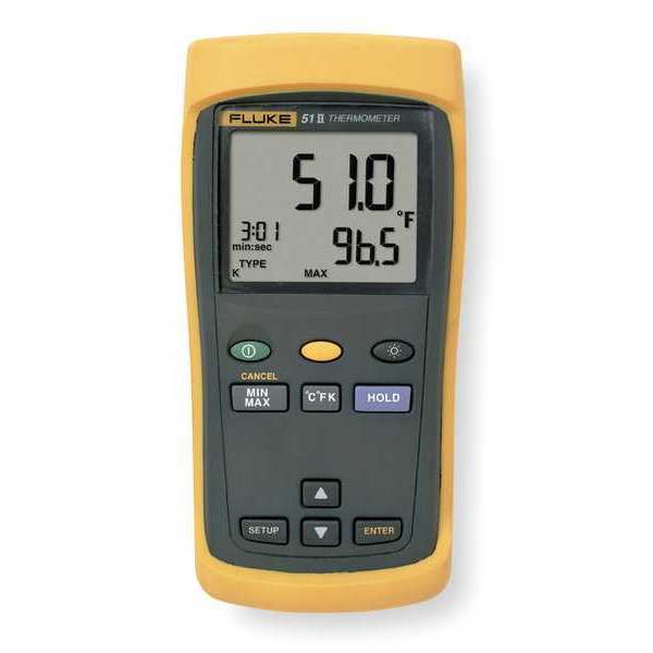$934.99 / eachWeb priceFluke-51-2 NIST Thermocouple ThermometerSKU G0858207CategoriesDescription Thermocouple Thermometer, Thermocouple, Includes NIST-Traceable Certificate Yes, Accuracy +/-0.05 Percent + 0.3 Degrees C, -150 Degrees to 1,000 Degrees C (Type E), -200 Degrees to 1,300 Degrees C (Type N), -200 Degrees to 1,372 Degrees C (Type K), -210 Degrees to 1,200 Degrees C (Type J), -250 Degrees to 400 Degrees C (Type T), 0 Degrees to 1,767 Degrees C (Type R, S), (3) AA, Backlit LCD, Functions Max/Min/Avg RecordgraingerSKU: null, mscSKU: null, zoro_no: G0858207, mongo_id: 65bbe6293aaddbd5a9010644