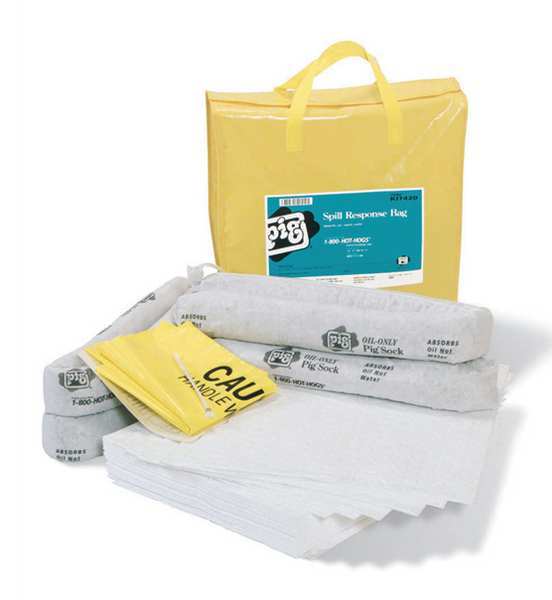 SKU G8310136CategoriesDescription Spill Kit, Fluids Absorbed Oil-Only, Volume Absorbed Per Kit 10 gal, Container Type Portable Bag, 6 in W x 17 in L x 20 1/2 in H Container Size, Yellow, Filled, Sorbents Included (28) 20 in L x 15 in W Pig STAT-MAT Oil-Only Absorbent Pad (MAT214), (4) 48 in L x Ext. dia. 3 in Pig Oil-Only Absorbent Sock (SKM210), Additional Components Included (5) 18 in W x 30 in H Polyethylene Disposal Bags (BAG20-1S), Spill Kit Vinyl Bag, Lockable No, Static Dissipative Yes, UV Resistant NograingerSKU: 30RE06, mscSKU: , zoro_no: G8310136, mongo_id: 65bbe7ee22d7a989a98caf8a