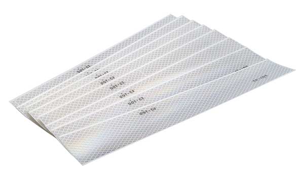 Description Premium Grade Reflective Tape, Reflective Color White, Width 2 in, Length 12 in, Adhesive Material Acrylic, Backing Material Retroreflective Microprismatic Material, Thickness 18 mil, Adhesion Strength 2.5 lb/in (FRP), 3.0 lb/in (Tedlar(R)), 3.0 lb/in (Prepainted Panel), 3.5 lb/in (Aluminum Rail), 5.3 lb/in (Degreased Aluminum), 6.0 lb/in (Stainless Steel), Backing Texture Smooth, Outdoor, Package Quantity 100