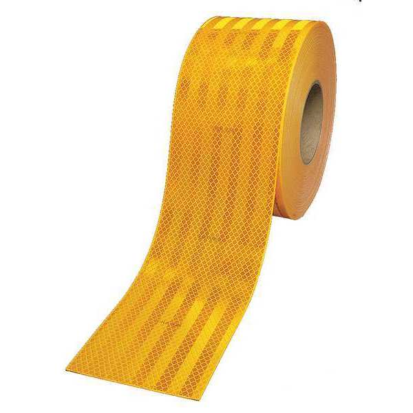 Description Conspicuity Reflective Tape, Reflective Color Fluorescent Yellow, Width 4 in, Length 50 yd, Adhesive Material Acrylic, Backing Material Retroreflective Microprismatic Material, Thickness 18 mil, Adhesion Strength 2.5 lb/in (FRP), 3.0 lb/in (Tedlar(R)), 3.0 lb/in (Prepainted Panel), 3.5 lb/in (Aluminum Rail), 5.3 lb/in (Degreased Aluminum), 6.0 lb/in (Stainless Steel), Outdoor