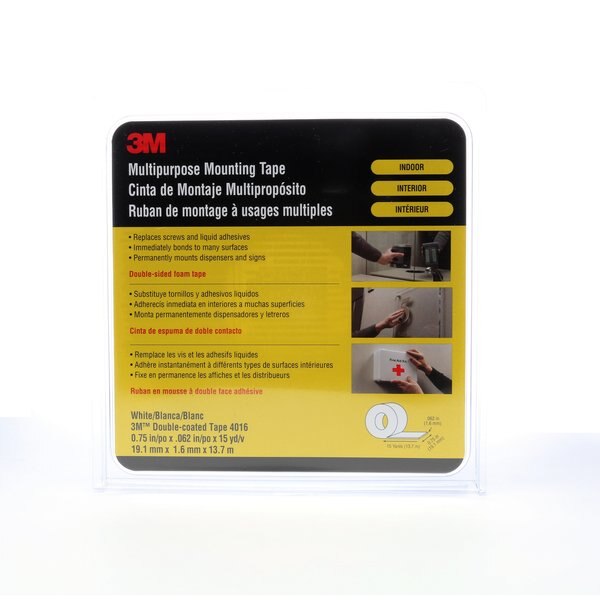 Description Tape Type Double-Sided Foam Tape, Tape Sub-Type Double-Sided Conformable Foam Tape, Tape Brand 3M(TM), Series 4016, Imperial Tape Length 15 yd, Imperial Tape Width 3/4 in, Imperial Tape WxL 3/4 in x 15 yd, Maximum Tape Performance Temperature 220 Degrees F, Minimum Tape Performance Temperature 50 Degrees F, Common Industry Assembly & Manufacturing, Construction, General Maintenance & Repair, Metalworking, Warehouse, Indoor Only, Continuous Roll