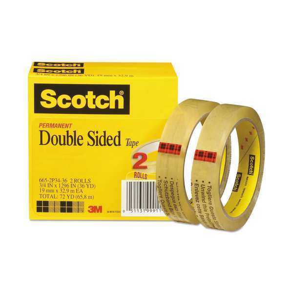 Description Double-Sided Office Tape, Double-Sided, 3M(TM), 665, 108 ft, 3/4 in, UPVC, 3 mil, Tape Adhesive Material Acrylic, Included Dispenser No Dispenser, Tape Core Diameter 3 in, Adhesive Properties Permanent Adhesive, Package Quantity 2