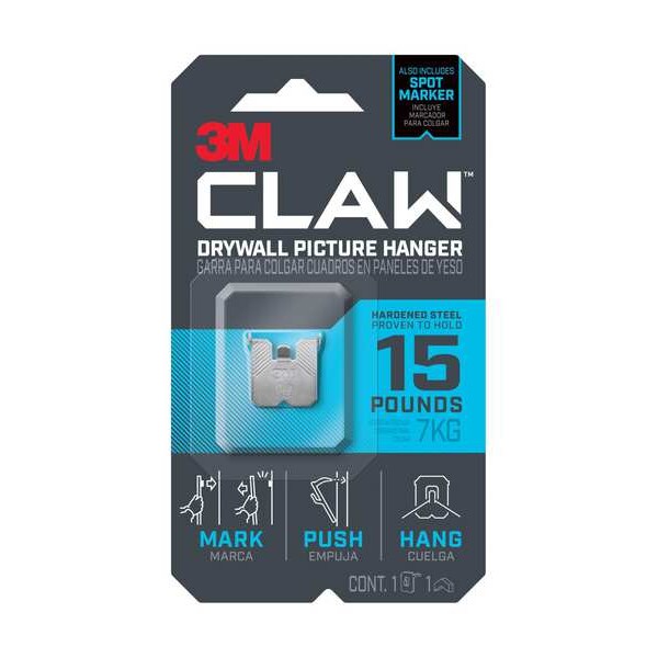 Description Picture Hanger, Fastening Method Push In, Points per Hook 1, Number of Hooks 1, Basic Hook Material Steel, Hook Finish Unfinished, Working Load Limit 15 lb, Hook Height 7/8 in, Hook Base Width 7/8 in, Projection 1/8 in, Includes 1 Hanger, 1 Spot Marker, Hardware Not Included, Mounting Wall