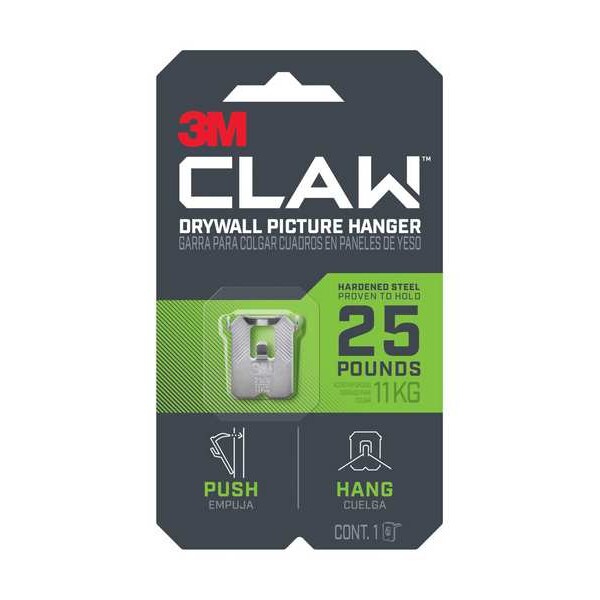 Description Picture Hanger, Fastening Method Push In, Points per Hook 1, Number of Hooks 1, Basic Hook Material Steel, Hook Finish Unfinished, Working Load Limit 25 lb, Hook Height 1 1/4 in, Hook Base Width 1 in, Projection 1/8 in, Includes 1 Hanger, Hardware Not Included, Mounting Wall