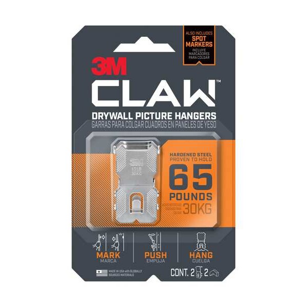 Description Picture Hanger, Fastening Method Push In, Points per Hook 1, Number of Hooks 2, Basic Hook Material Steel, Hook Finish Unfinished, Working Load Limit 65 lb, Hook Height 2 in, Hook Base Width 1 1/8 in, Projection 1/8 in, Includes 2 Hangers, 2 Spot Markers, Hardware Not Included, Mounting Wall, Package Quantity 2