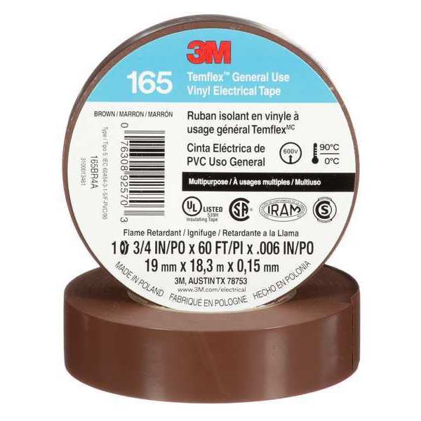 SKU G403510066Categories Adhesives, Epoxy & SealantsDescription Insulating Electrical Tape, General Purpose, Vinyl, Tape Adhesive Material Rubber, 3/4 in, 60 ft, 6 mil, 3M(TM), Temflex(TM), Series 165, Brown, Minimum Tape Performance Temperature 32 Degrees F, Maximum Tape Performance Temperature 194 Degrees F, Voltage Rating 600 V, Continuous Roll, Single-SidedgraingerSKU: 61CF51, mscSKU: , zoro_no: G403510066, mongo_id: 65bbe9fd22d7a989a998c138