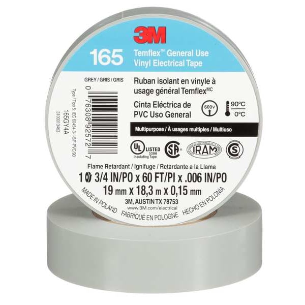 SKU G203327246Categories Adhesives, Epoxy & SealantsDescription Insulating Electrical Tape, General Purpose, Vinyl, Tape Adhesive Material Rubber, 3/4 in, 60 ft, 6 mil, 3M(TM), Temflex(TM), Series 165, Gray, Minimum Tape Performance Temperature 32 Degrees F, Maximum Tape Performance Temperature 194 Degrees F, Voltage Rating 600 V, Continuous Roll, Single-SidedgraingerSKU: 61CF52, mscSKU: , zoro_no: G203327246, mongo_id: 65bbe8ab22d7a989a990aeb7