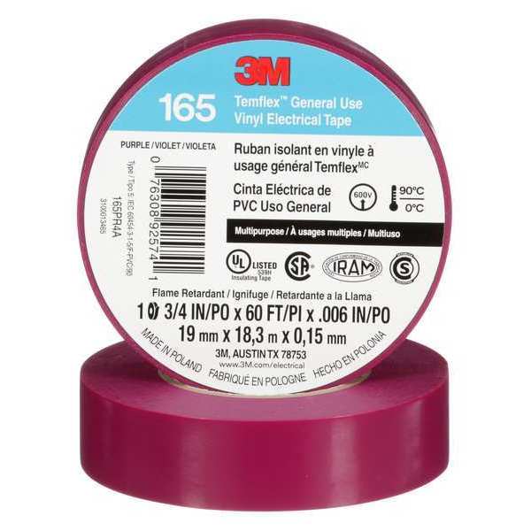 SKU G603510064Categories Adhesives, Epoxy & SealantsDescription Insulating Electrical Tape, General Purpose, Vinyl, Tape Adhesive Material Rubber, 3/4 in, 60 ft, 6 mil, 3M(TM), Temflex(TM), Series 165, Purple, Minimum Tape Performance Temperature 32 Degrees F, Maximum Tape Performance Temperature 194 Degrees F, Voltage Rating 600 V, Continuous Roll, Single-SidedgraingerSKU: 61CF54, mscSKU: , zoro_no: G603510064, mongo_id: 65bbe7ba9a749db822750fae
