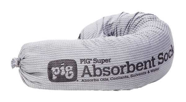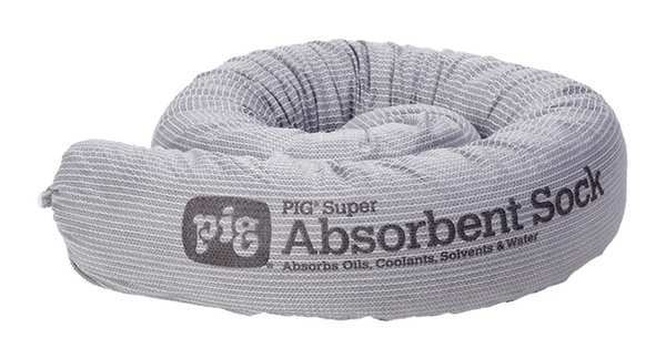 Description Product Type Sorbent Sock, Fluids Absorbed Universal, For Use With Chemical or Metal Type Coolants, Oils, Solvents, Water, Size 3 1/4 in x 42 in, Volume Absorbed Per Sock/Boom 1 gal, Volume Absorbed per Pkg. 24 gal, Color/Pattern Gray, Filler Material Cellulose, Outer Mesh Material Polypropylene, Outside Skin Material Polypropylene, Sock/Boom Profile Round, Package Quantity 24