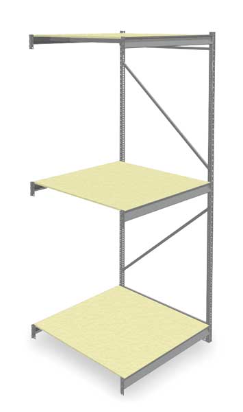 $1,026.24 / eachWeb priceAdd-On Bulk Storage Rack, 36 in D, 96 in W, 3 ShelvesSKU G3404037CategoriesDescription Bulk Storage Rack, Shelving Type Add-On, Overall Width 96 in, Overall Depth 36 in, Overall Height 96 in, Decking Material Particleboard, No. of Shelves 3, Shelf Capacity 2150 lb, Load Capacity 6450 lb, Shelving Frame Material Steel, Gray, Finish - Shelving and Racks Powder Coated, Shelf Adjustments 2 in, For Use With Tennesco Bulk Storage and Boltless Racks, Includes (3) Shelves, End FramegraingerSKU: 7B142, mscSKU: , zoro_no: G3404037, mongo_id: 65bbea6b22d7a989a99b2ff6
