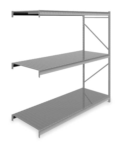 $659.99 / eachWeb priceAdd-On Bulk Storage Rack, 36 in D, 96 in W, 3 ShelvesSKU G0459742CategoriesDescription Bulk Storage Rack, Shelving Type Add-On, Overall Width 96 in, Overall Depth 36 in, Overall Height 72 in, Decking Material Steel, No. of Shelves 3, Shelf Capacity 2150 lb, Load Capacity 6450 lb, Shelving Frame Material Steel, Gray, Finish - Shelving and Racks Powder Coated, Shelf Adjustments 2 in, Shelving Gauge 22, For Use With Tennesco Bulk Storage and Boltless Racks, Includes (3) Shelves, End FramegraingerSKU: 7B142, mscSKU: , zoro_no: G0459742, mongo_id: 65bbee41526e052139afd776