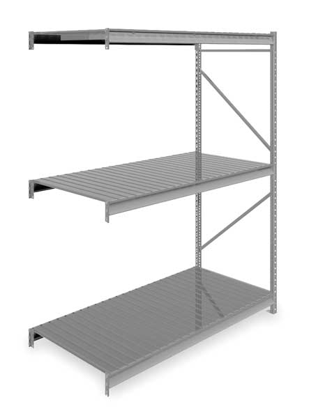 $1,272.49 / eachWeb priceAdd-On Bulk Storage Rack, 36 in D, 96 in W, 3 ShelvesSKU G1461476CategoriesDescription Bulk Storage Rack, Shelving Type Add-On, Overall Width 96 in, Overall Depth 36 in, Overall Height 120 in, Decking Material Steel, No. of Shelves 3, Shelf Capacity 2150 lb, Load Capacity 6450 lb, Shelving Frame Material Steel, Gray, Finish - Shelving and Racks Powder Coated, Shelf Adjustments 2 in, Shelving Gauge 22, For Use With Tennesco Bulk Storage and Boltless Racks, Includes (3) Shelves, End FramegraingerSKU: 7B142, mscSKU: , zoro_no: G1461476, mongo_id: 65bbe87822d7a989a98f87fe