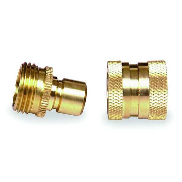 Description Garden Hose Adapter, For Hose I.D. 3/4 in, Hose Fitting A Gender Male, Hose Fitting B Gender Female, Hose Fitting A Size 3/4 in, Hose Fitting B Size 3/4 in, Hose Fitting A Connection Type GHT, Hose Fitting B Connection Type GHT, Fitting Material Brass x Brass, Includes Male/Female, W/Auto Shut Off