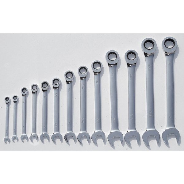 $254.99 / eachWeb priceRatcheting Wrench Set, CombinationSKU G9078352CategoriesDescription Combination Wrench Set, Alloy Steel, Mirror, Number of Tools 13, Range of Head Sizes 1/4 in to 1 in, Head Offset Angle 0 Degrees , Standard, Storage Rack, SAE, 1/4 in, 5/16 in, 3/8 in, 7/16 in, 1/2 in, 9/16 in, 5/8 in, 11/16 in, 3/4 in, 13/16 in, 7/8 in, 15/16 in, 1 in, Rounded, Opening Angle (Deg.) 15 DegreesgraingerSKU: , mscSKU: , zoro_no: G9078352, mongo_id: 65bbe6153aaddbd5a90069f0