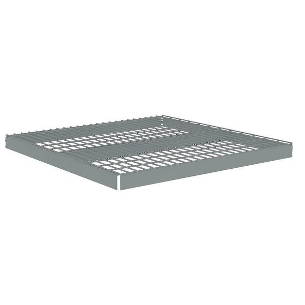 Description Shelf, Gray, Particleboard, Unfinished Decking Finish, Single Straight, Zinc Plated, Frame Material Steel, Overall Height 2 3/4 in, Overall Width 48 in, Overall Depth 48 in, Load Capacity 2,250 lb, Includes (4) Angle Beams, (4) Front to Back Deck Supports