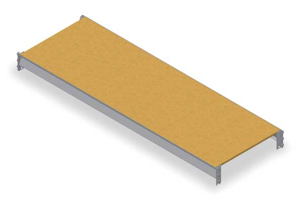 Description Shelf, Gray, Particleboard, Unfinished Decking Finish, Single Straight, Zinc Plated, Frame Material Steel, Overall Height 3 1/4 in, Overall Width 48 in, Overall Depth 48 in, Load Capacity 2,500 lb, Includes (2) Angle Beams, (2) Channel Beams, (2) Front to Back Deck Supports