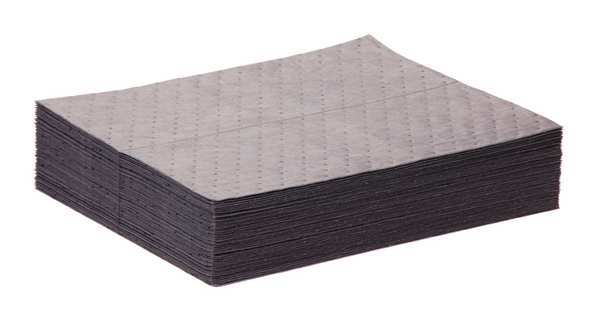 Description Product Type Sorbent Pad, Fluids Absorbed Universal, For Use With Chemical or Metal Type Universal, Size 15 in x 20 in, Volume Absorbed Per Pad 14 oz, Volume Absorbed per Pkg. 5 gal, Color/Pattern Gray, Material Polypropylene, Number of Layers 8-ply, Perforated Yes, Perforated Size 10 in x 15 in, Package Quantity 50